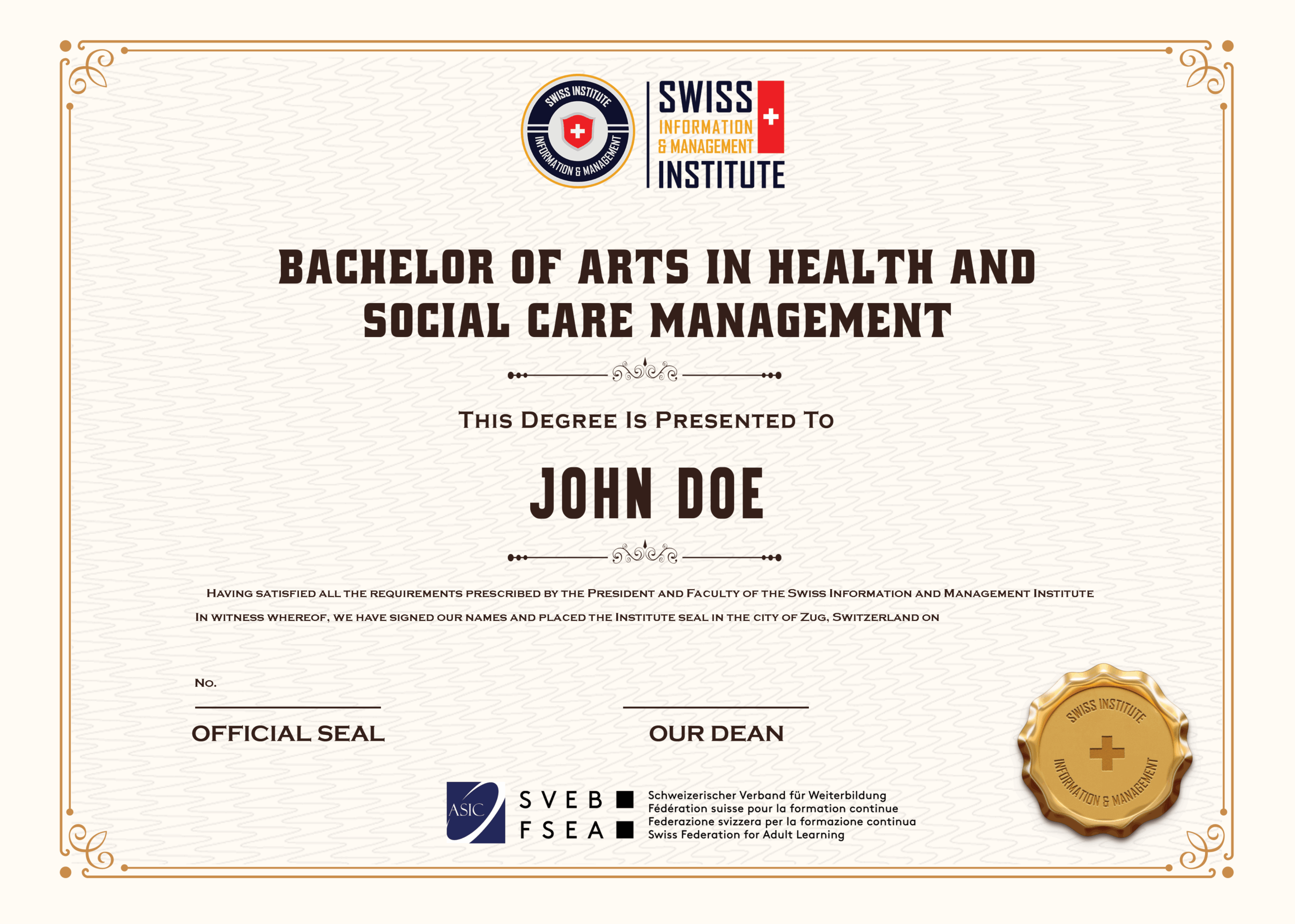 - Bachelor of Arts in Health and Social Care Management – cấp bởi SIMI Swiss (Thụy Sĩ)