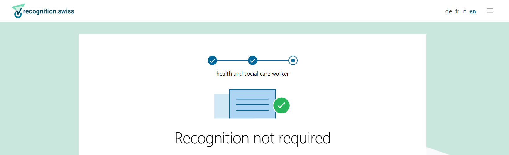 Văn bằng SwissUK do SIMI cấp được công nhận khi làm việc tại Thụy Sĩ mà không cần thêm bất kỳ thủ tục bổ sung nào, vì vị trí Health and Social Care Worker thuộc nhóm nghề nghiệp không yêu cầu giấy phép hành nghề.