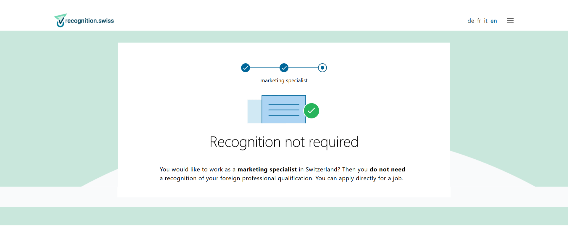 Văn bằng SwissUK do SIMI cấp được công nhận khi làm việc tại Thụy Sĩ mà không cần thêm bất kỳ thủ tục bổ sung nào, vì vị trí Marketing Specialist thuộc nhóm nghề nghiệp không yêu cầu giấy phép hành nghề.