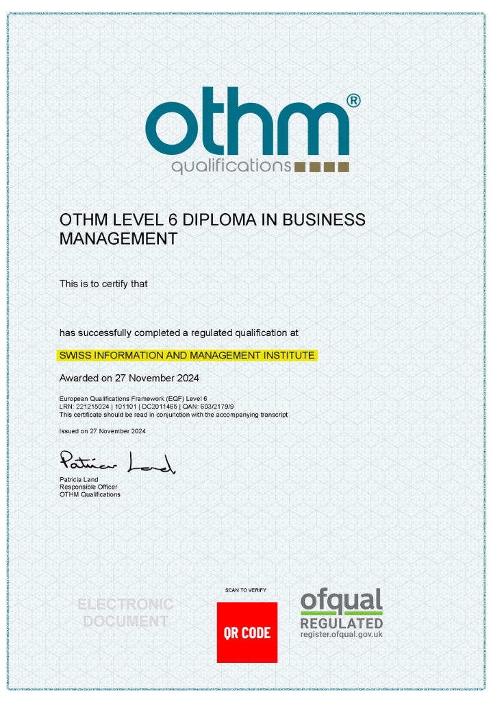 - OTHM Level 6 Diploma in Business Management được kiểm định với mã Ofqual UK.Gov 603/2179/9. Tham khảo thông tin công nhận TẠI ĐÂY.