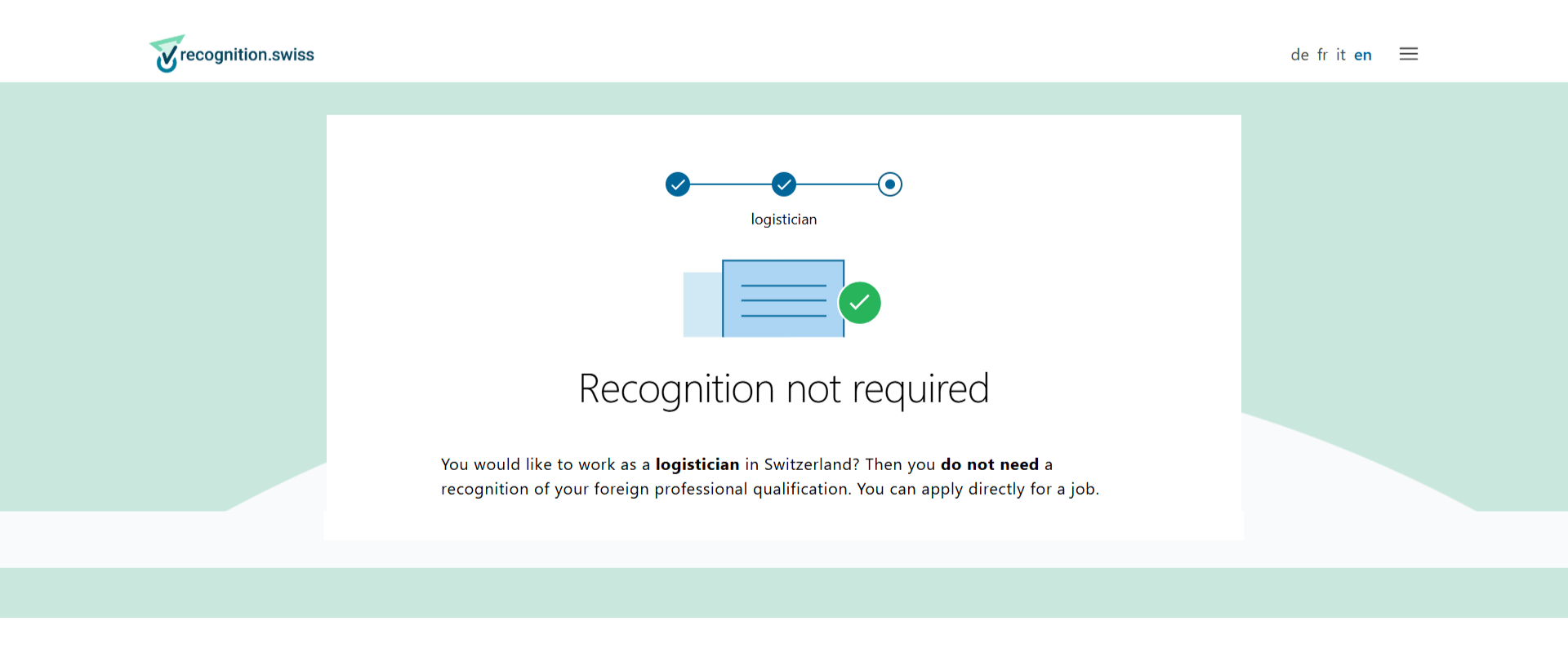 Văn bằng SwissUK do SIMI cấp được công nhận khi làm việc tại Thụy Sĩ mà không cần thêm bất kỳ thủ tục bổ sung nào, vì vị trí Logistician thuộc nhóm nghề nghiệp không yêu cầu giấy phép hành nghề.